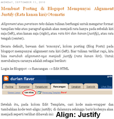 Sekarang, setiap postingan akan mempunyai alignment justify secara otopmatis. Jadi ga perlu repot-repot lagi untuk mengatur setingan alignmentnya sebelum tulisan di posting.